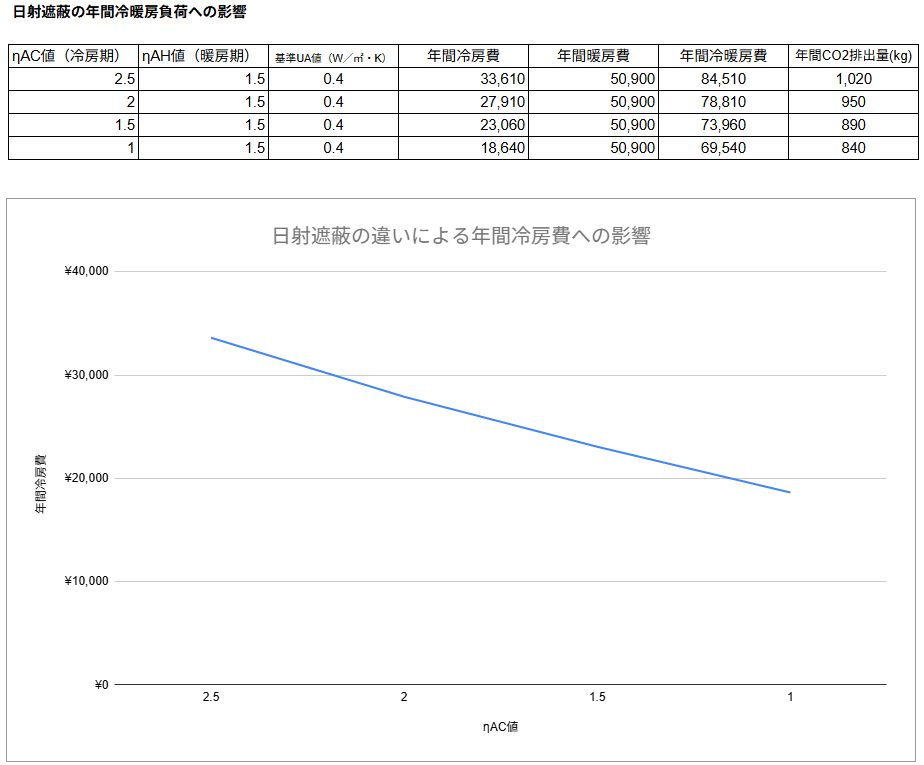 「ηAC値(冷房期) 」、「ηAH値(暖房期) 」、「UA値」のうち、「ηAC値(冷房期) 」のみを変化させて、冷暖房負荷をシミュレーションしました。