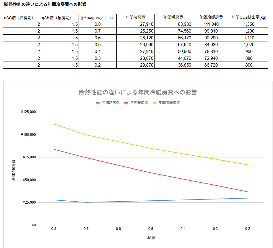 1. 断熱性能の違いによる年間の冷暖房費への影響